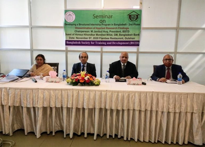 বাংলাদেশ প্রশিক্ষণ ও উন্নয়ন সমিতি (বিএসটিডি)’র ব্যবস্থাপনায় এবং বাংলাদেশ ব্যাংকের অর্থায়নে পরিচালিত “Developing a Structured Internship Program in Bangladesh - 2nd Phase” শীর্ষক গবেষণা প্রকল্পের সেমিনার গত ৭ নভেম্বর ২০২০, শনিবার বেলা ১১:০০ টায় ফ্ল্যামবী রেষ্টুরেন্ট, বাড়ী নং-৬, রোড নং- ৫০, গুলশান-২, ঢাকায় সরকার ঘোষিত স্বাস্থ্যবিধি মেনে সফলভাবে অনুষ্ঠিত হয়েছে। পবিত্র কুরআন তিলাওয়াতের মাধ্যমে অনুষ্ঠান শুরু হয়। পবিত্র কুরআন তিলাওয়াত করেন বিএসটিডি’র নির্বাহী কর্মকর্তা জনাব মুহাম্মদ জিল্লুর রহমান। সেমিনারে সম্মানিত অতিথি হিসেবে উপস্থিত ছিলেন খন্দকার মোরশেদ মিল্লাত, মহাব্যবস্থাপক (এসএফডি), বাংলাদেশ ব্যাংক, প্রধান কার্যালয়, ঢাকা। অনুষ্ঠানে সভাপতিত্ব করেন বাংলাদেশ প্রশিক্ষণ ও উন্নয়ন সমিতি (বিএসটিডি)’র সভাপতি জনাব এম জানিবুল হক। সঞ্চালক হিসেবে দায়িত্ব পালন করেন সমিতির আজীবন সদস্য বেগম নুরুন নেসা বেগম। স্বাগত বক্তব্য দেন সমিতির মহাসচিব জনাব এম খায়রুল কবীর। প্রকল্প দলনেতা বেগম তাহামিন বানু গবেষণা প্রকল্পের লক্ষ্য, উদ্দেশ্য ও ফাইন্ডিংস উপস্থাপন করেন। উপস্থাপিত ফাইন্ডিংস এর ওপর আলোচনায় অংশগ্রহণ করেন সোনালী ব্যাংকের উপব্যবস্থাপনা পরিচালক জনাব মো: আফজাল করীম, বাংলাদেশ ব্যাংকের যুগ্ন-পরিচালক জনাব অমিত চক্রবর্তী, আলহাজ্ব বিলকিস বেগম, ড.আবুল হোসেন, বেগম সালেহা বেগম, সাবেক রাষ্ট্রদূত জনাব সাহেদ আকতার, জনাব হাসান সারওয়ার,আলহাজ¦ আব্দুল লতিফ মিঞা, জনাব এস এম ইব্রাহিম হোসাইন, জনাব মিফতা নাঈম হুদা, জনাব সাইফুল আলম, ড.কামাল উদ্দীন জসীম এবং মঞ্জুরুল আলম পান্না প্রমুখ।